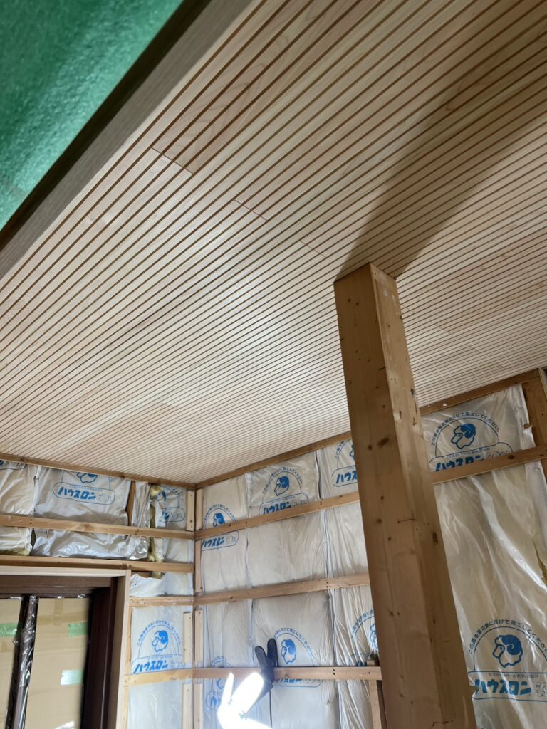 現場は順調で、天井に檜のリブ羽目板が施工されました。
