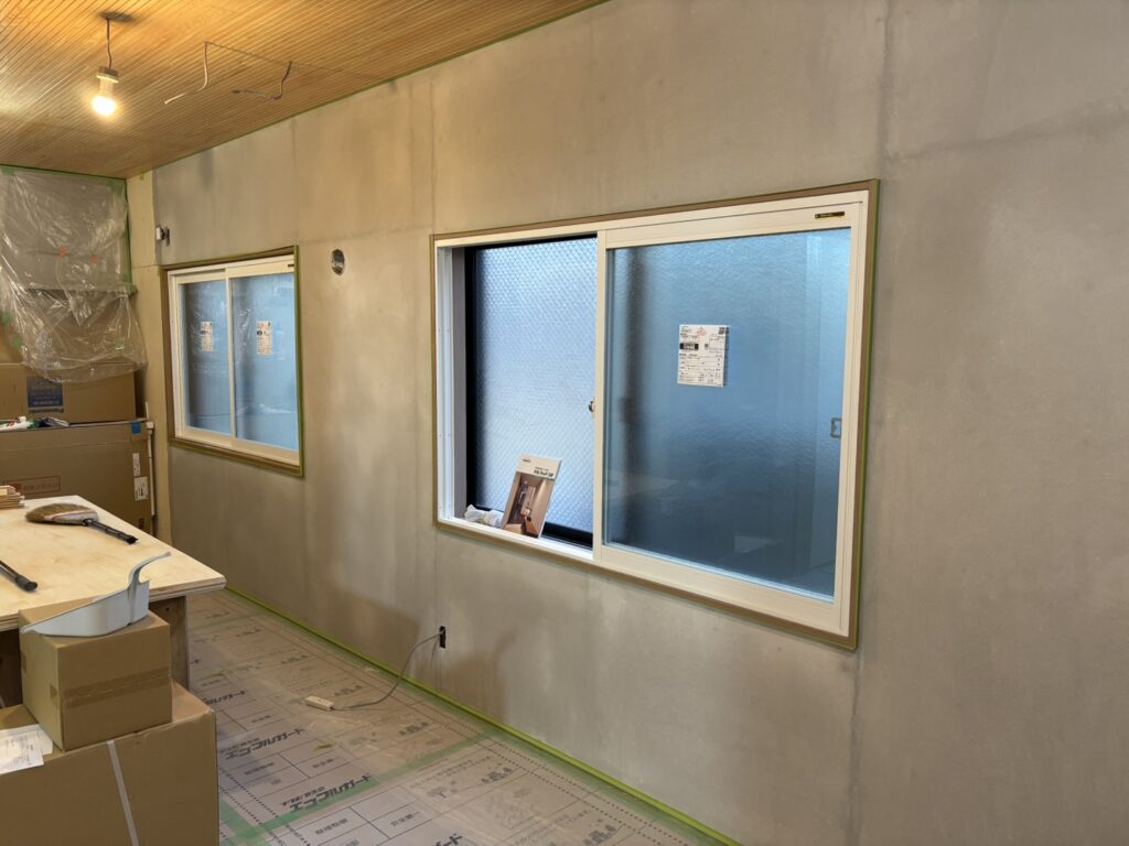 今回リビングは珪藻土です。下塗りが完了していました。